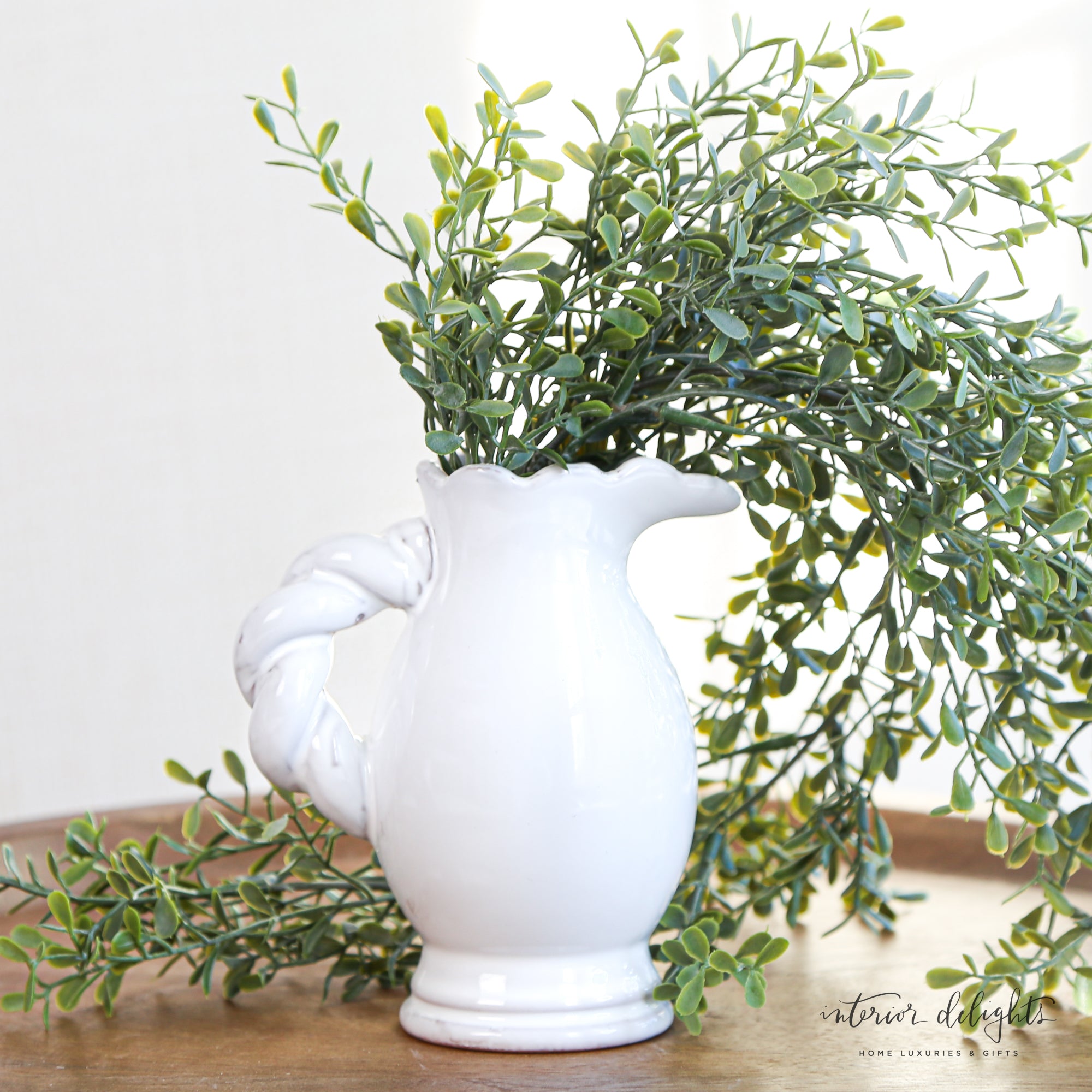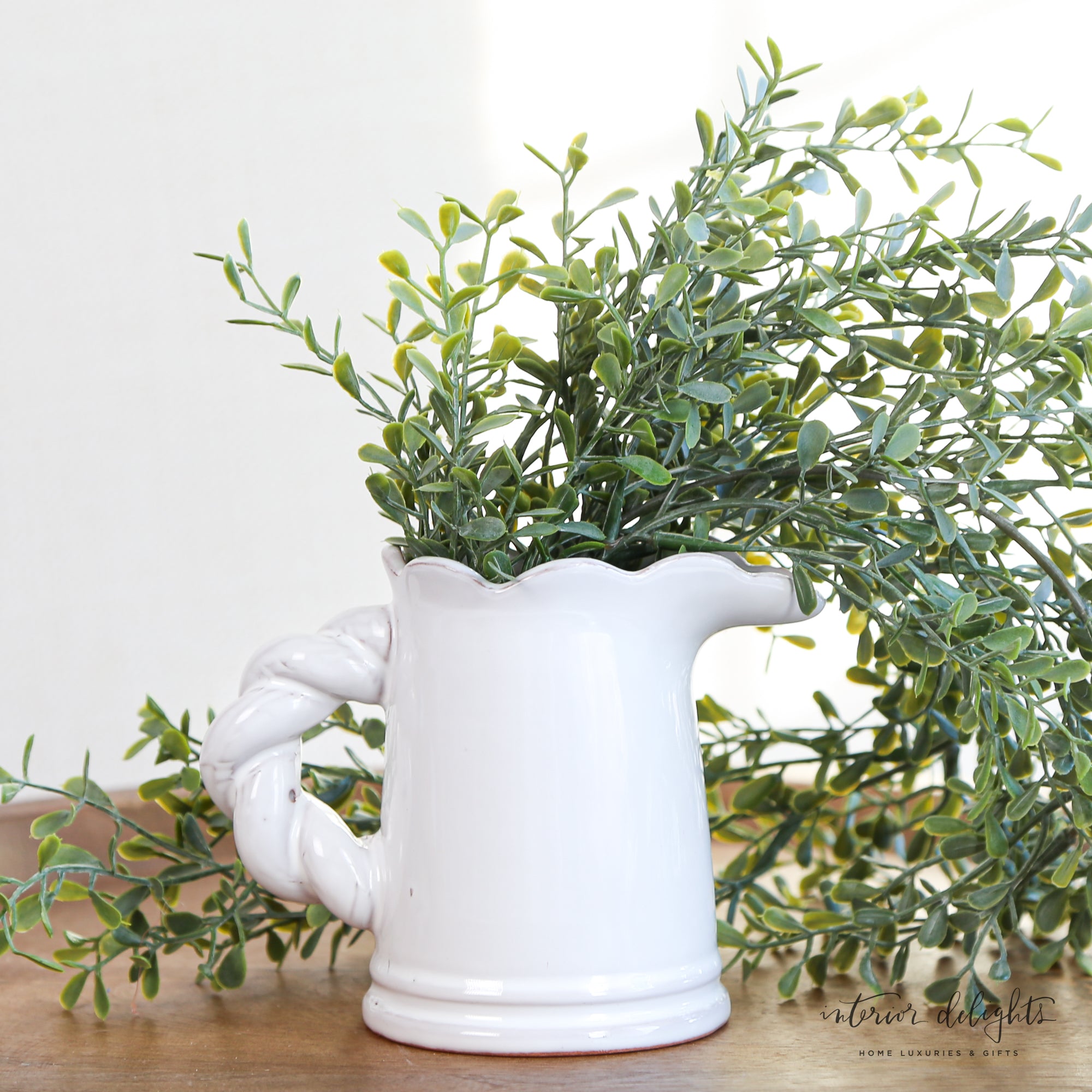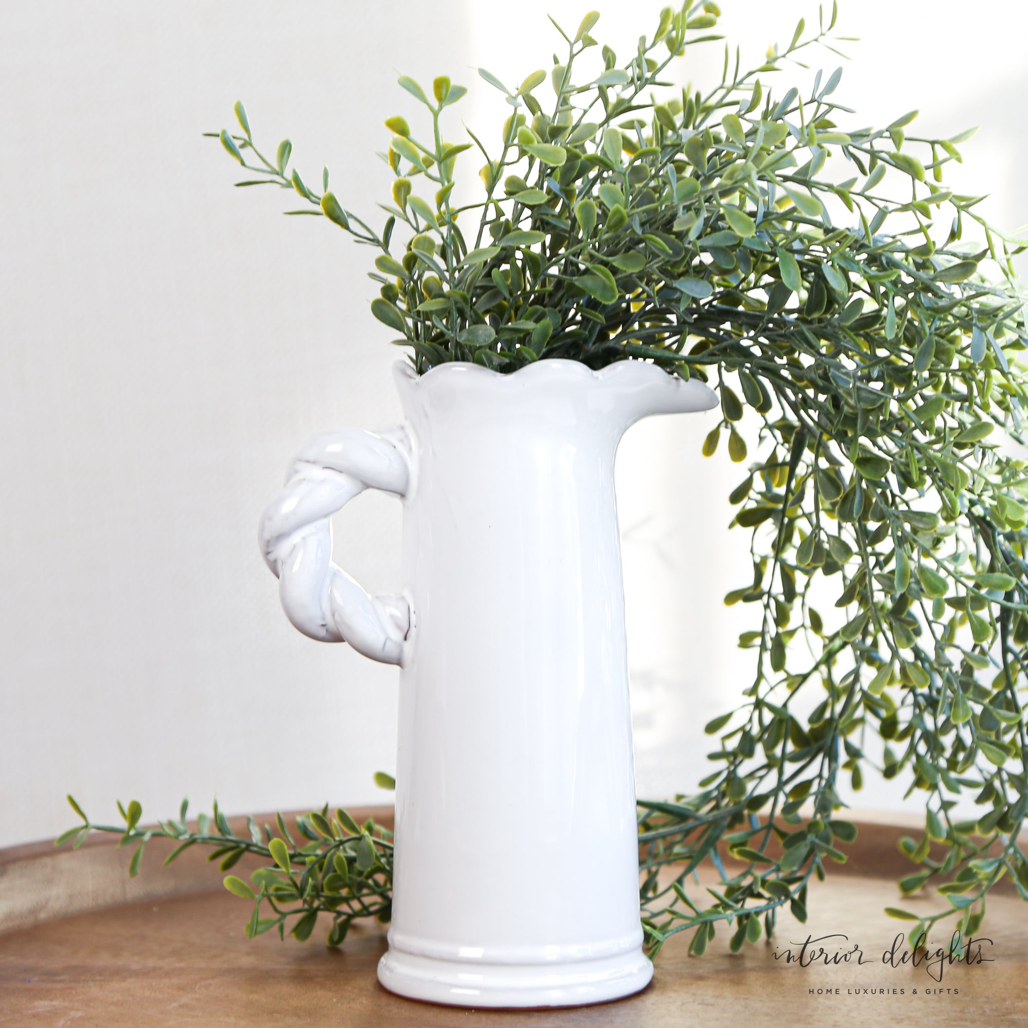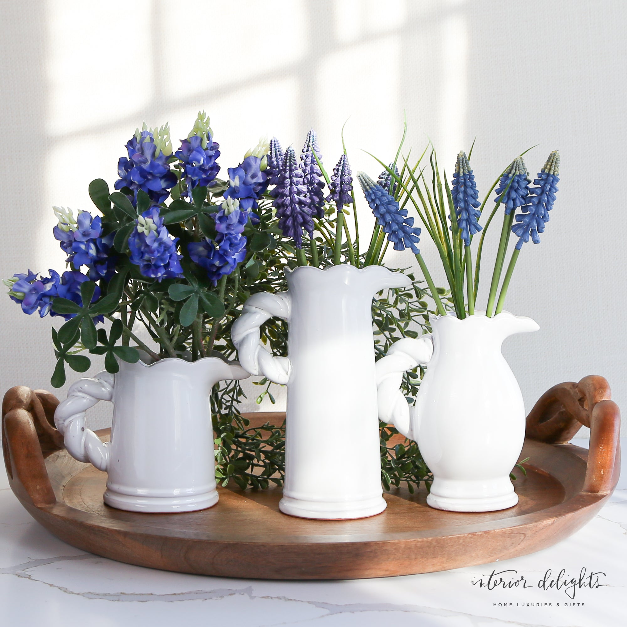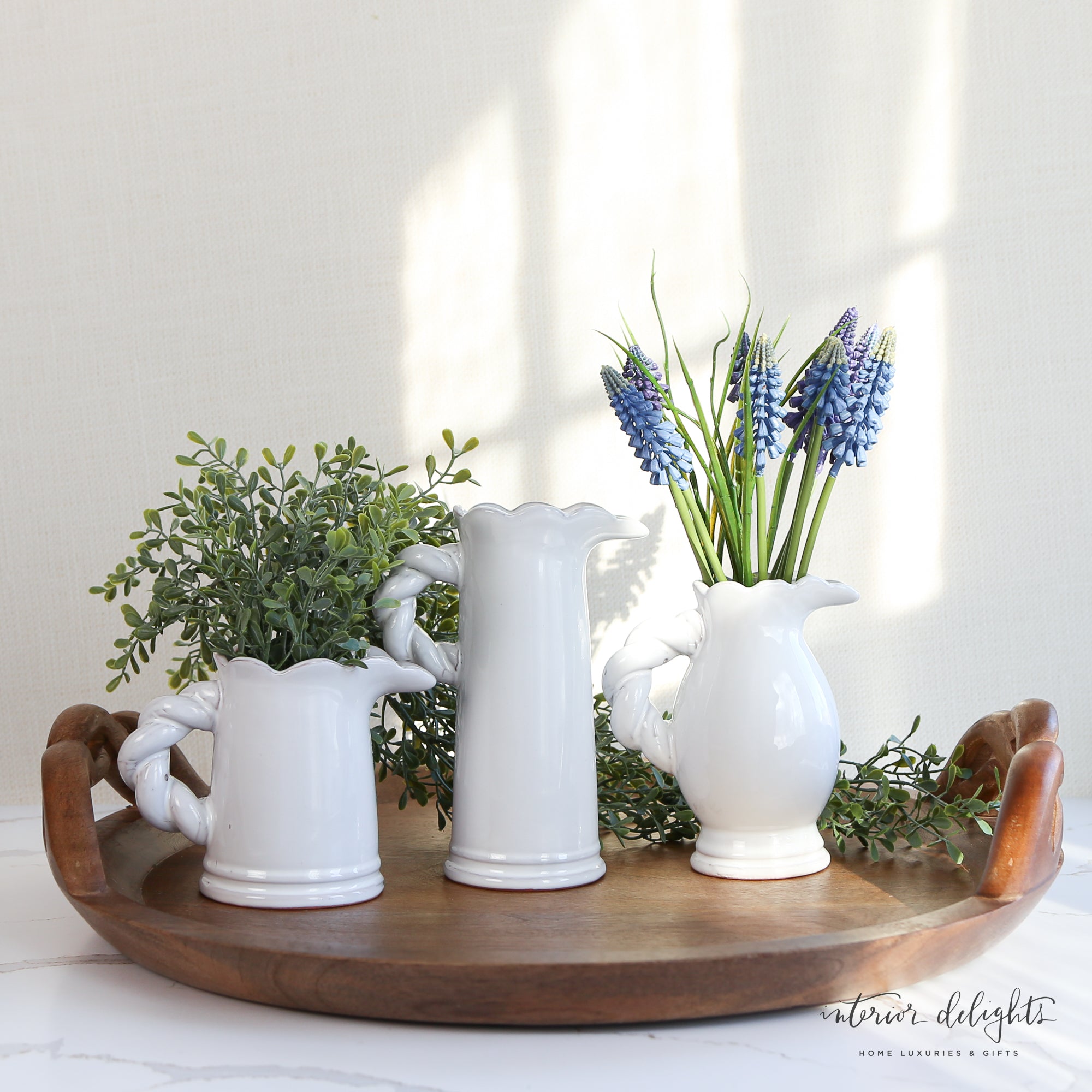 Add a touch of cottage charm to your home with these Mini Twisted Handle Pitcher Vases, featuring scalloped edges and graceful, curved handles.