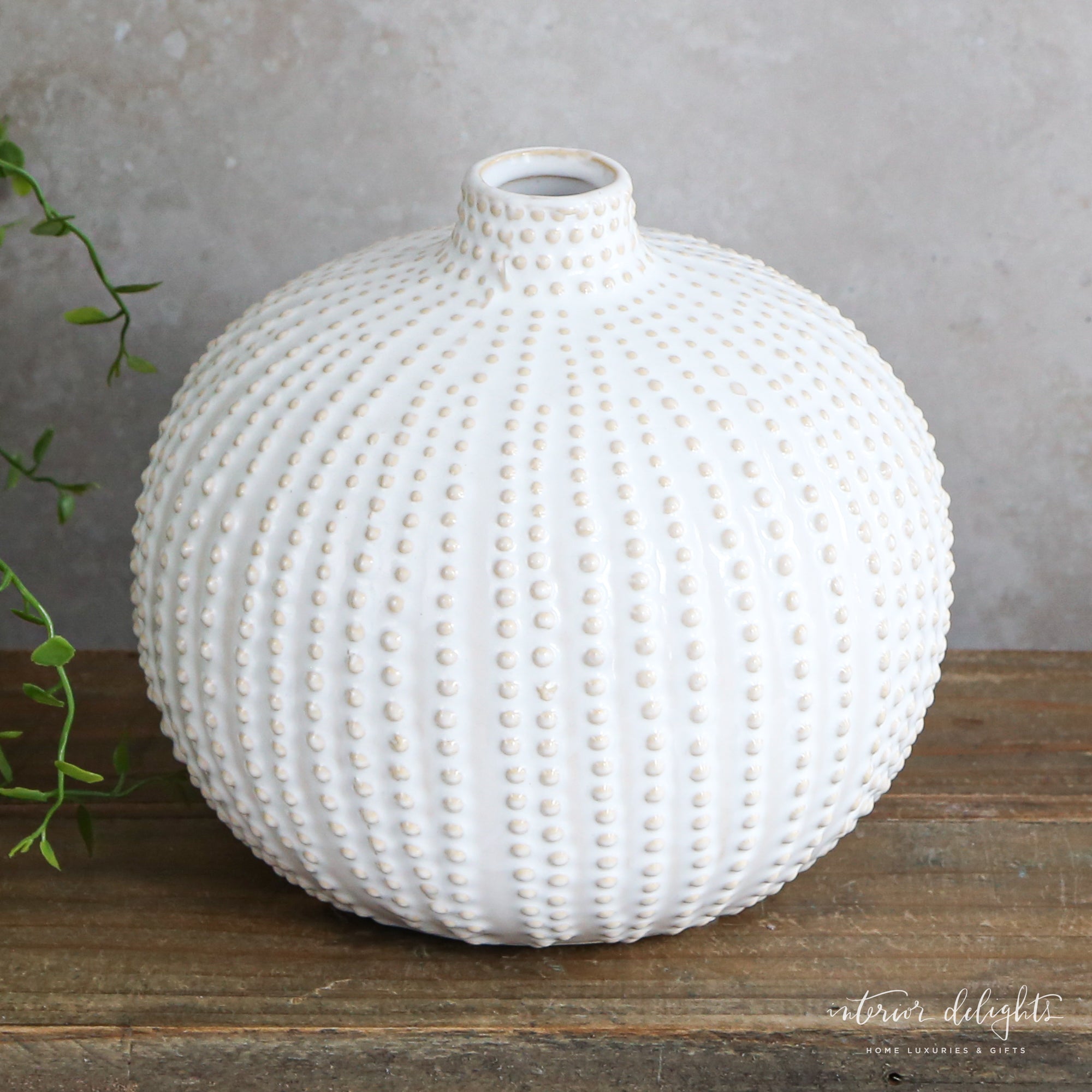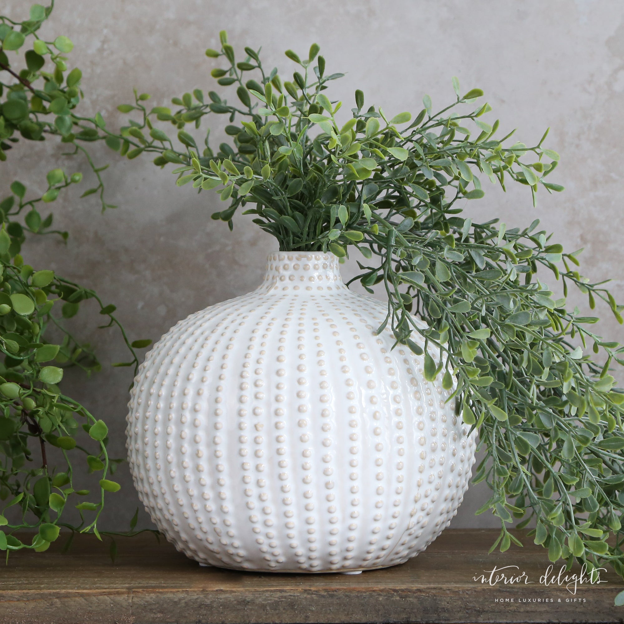 The Sand Dot Round Vase brings effortless texture and charm with its subtle dotted vertical design and organic shape. Measuring 6.25″ high by 6″ in diameter, its neutral tones blend beautifully with any decor style. Perfect for fresh or dried florals, this vase adds a soft, artisanal touch to shelves or tabletops. A timeless accent piece for any space. Shown with our Hanging Tea Leaf Bush.