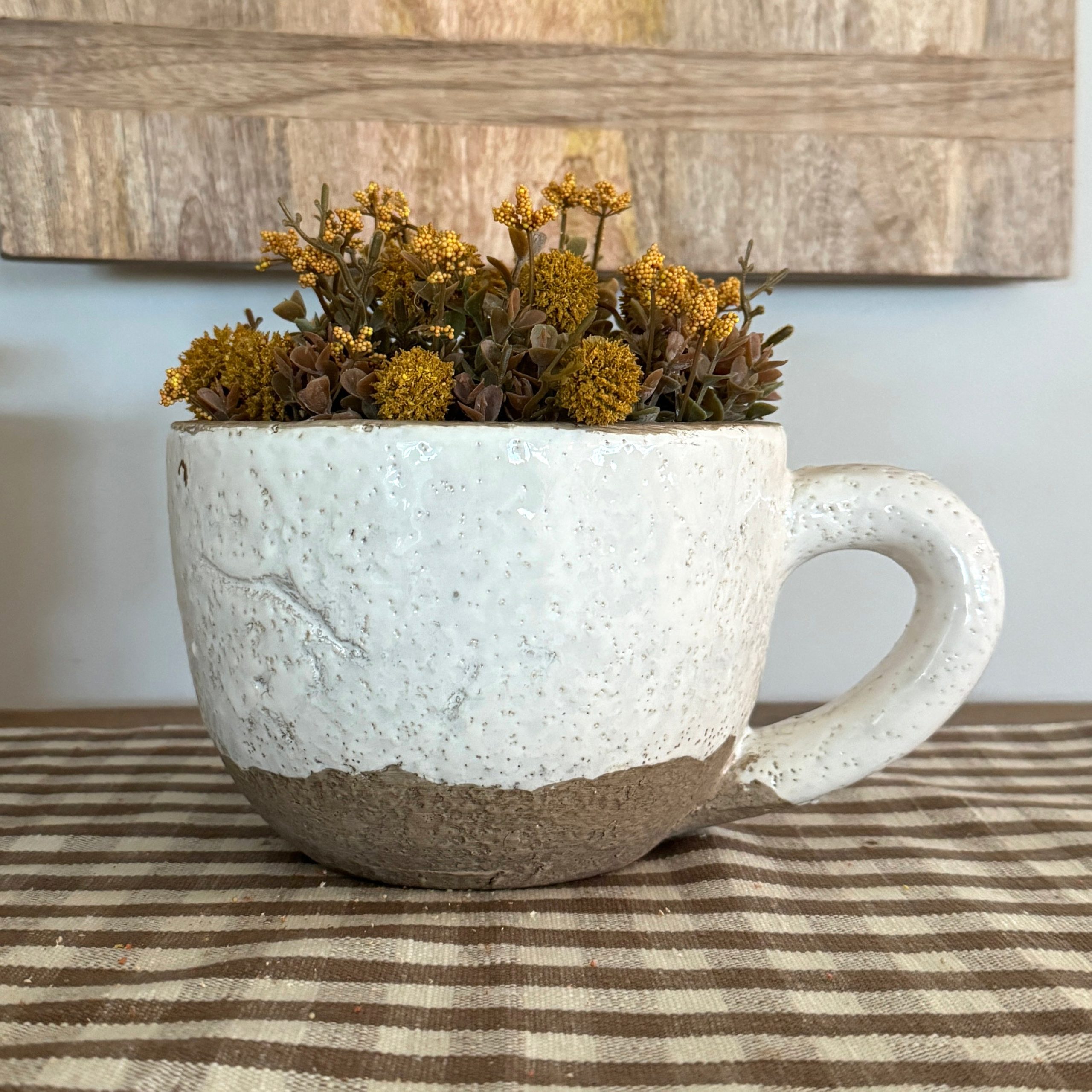What better way to celebrate fall than with this oversized mug planter? While not intended for beverages, it’s perfect for displaying seasonal plants and arrangements.